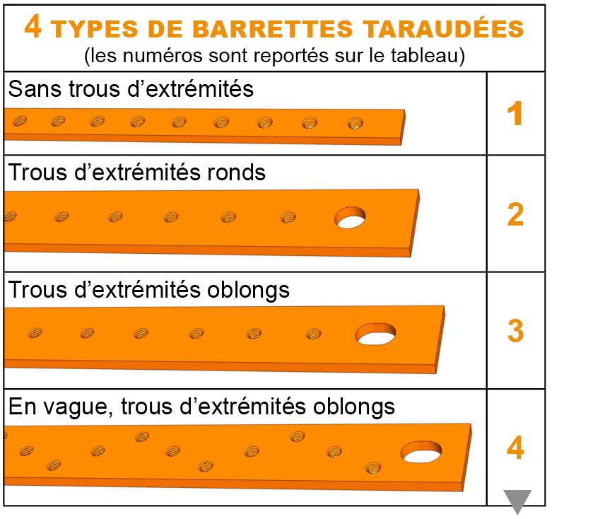 BARRETTES CUIVRE TARAUDÉES : NOS DIMENSIONS STANDARD EN STOCK Utiliser le curseur à droite pour faire défiler les références |